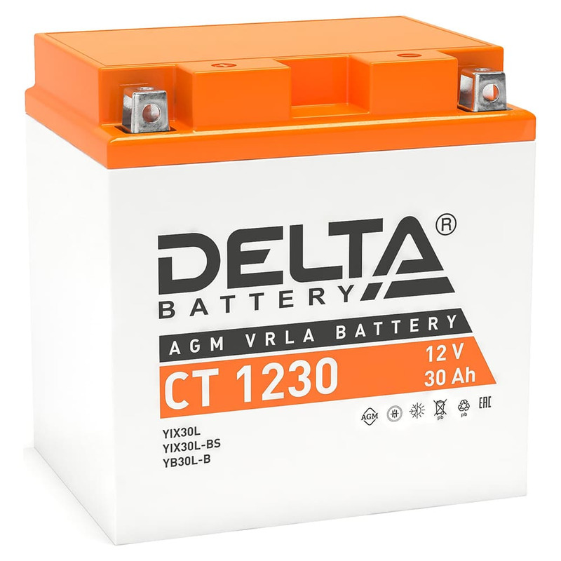 Аккумулятор Delta CT 1230: напряжение 12 В, емкость 30 А*ч, полярность "обратная", технология AGM.