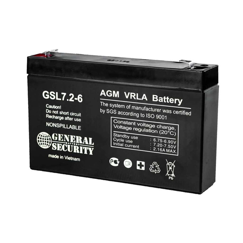General Security GSL 7.2-6 – свинцово-кислотный аккумулятор, напряжением 6 В и ёмкостью 7.2 А*ч. Наилучшее использование такой батареи достигается в буферном режиме. Аккумулятор может храниться при температуре при 25°С в течение 6 месяцев, саморазряд составит 3% в месяц. Корпус АКБ выполнен из ABS материала (акрило-бутадиен-стирол), который обеспечивает герметичность.