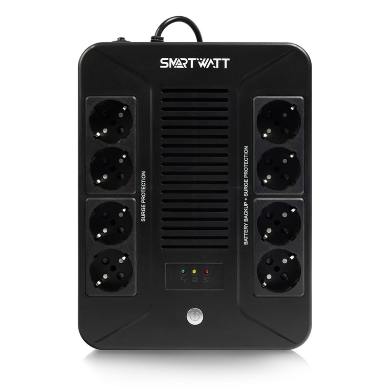 SMARTWATT UPS SAFE PRO — универсальный источник бесперебойного питания, предназначенный для защиты офисного и торгового оборудования, а также для бытового применения. ИБП оснащен 8 розетками, имеет интуитивно понятную LED-индикацию для обеспечения безопасной работы компьютерной и другой техники. При необходимости ИБП можно разместить на стене для экономии пространства на рабочем месте или для удобства пользователя.